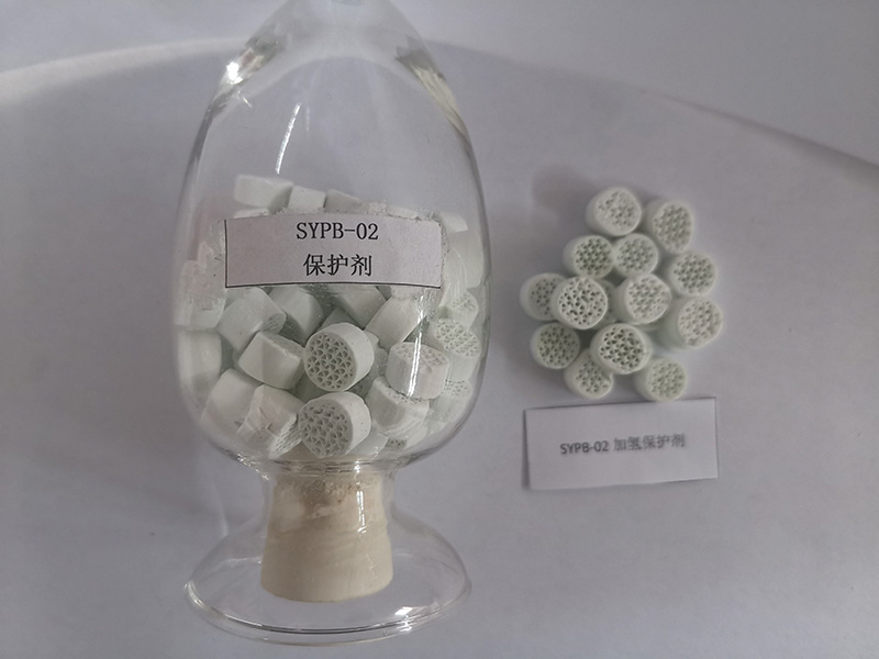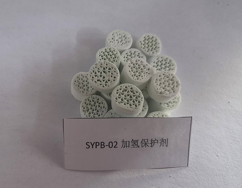SYPB-02是負(fù)載適量金屬的蜂窩鳥巢保護(hù)劑,此保護(hù)劑是在高孔容大比表面積異形載體上負(fù)載優(yōu)選的活性金屬組元,可對原料中的膠質(zhì)和烯烴以及稠環(huán)芳烴、金屬進(jìn)行轉(zhuǎn)化和加氫飽和,達(dá)到防止壓降上升、延長運轉(zhuǎn)周期、脫膠質(zhì)、保護(hù)主催化劑的目的。